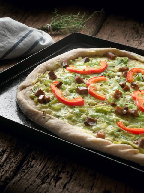 Flammkuchen mit Lauch und pikantem Räuchertofu