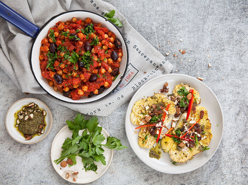 Blumenkohl auf Teller geben, das Rosinen-Dressing und Honig oder Ahornsirup darüber träufeln und mit Kräuterpesto und den Mandeln garnieren Petersilie über Blumenkohl ‚Steaks‘ sowie Shakshuka verteilen und beides gemeinsam servieren. Schmeckt auch gut mit Joghurt und / oder Brot.